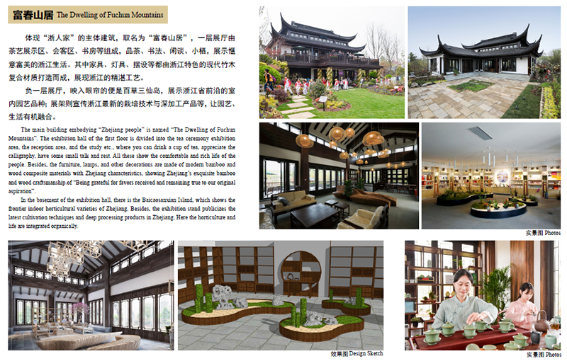 浙江園內(nèi)體現(xiàn)“浙人家”的主體建筑取名為“富春山居”,該建筑以浙派民居為原型,飛檐翹角,格局大氣,盡顯浙江風(fēng)情。深化這個建筑單體,團(tuán)隊(duì)做了很多功課,花了許多心思,考察了許多浙江特色民居,在充分運(yùn)用現(xiàn)代建筑材料與結(jié)構(gòu)的基礎(chǔ)上,通過對浙江傳統(tǒng)民居建筑的經(jīng)典片段提取和抽象提煉,賦予這些元素和符號以新的意義,構(gòu)建出浙江傳統(tǒng)民居的新風(fēng)貌。它不是對傳統(tǒng)民居建筑的照抄照搬,而是繼承和創(chuàng)新,設(shè)計(jì)了一棟獨(dú)一無二的建筑。