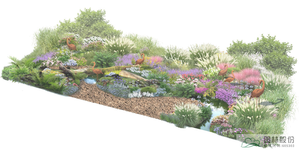 以千鳥花、密花千屈菜、美女櫻等觀賞草本花卉為主,點(diǎn)綴以小兔子狼尾草等觀賞草,重現(xiàn)濕地草甸中繁花似錦的美麗場(chǎng)景。