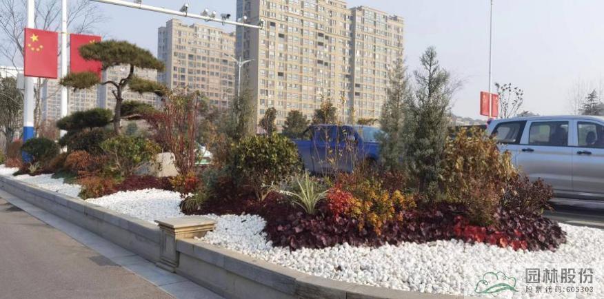 江山大道與黃山路、黃浦江路與項王路路口的植物配置,采用群落結構、組團配置和盆景化的自然式造園手法,在空間、色彩、節奏方面獨具匠心,打造了高低錯落、疏密有致的和諧景觀。考慮到行車安全性與視線誘導因素,中央綠化隔離帶以黑松樁的種植片段和花鏡+球類的自然群落片段進行循環,打造規則中有自然的效果。機非綠化隔離帶以黑松樁+花鏡種植,打造艷麗的春景效果。
